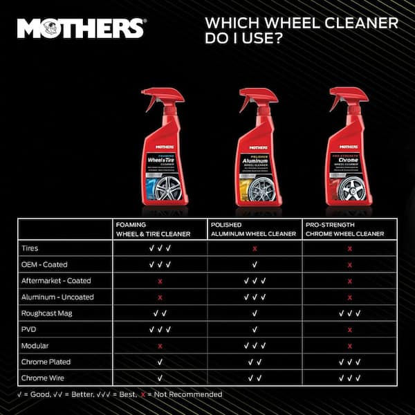 Mothers Chrome Wheel Cleaner is specially formulated to quickly and easily clean chrome wire wheels, chrome plated wheels, hubcaps and rough cast aluminum “mag” wheels. This is a high-impact foaming cleaner. Its spray on, hose off design safely penetrates, dissolves and suspends all types of brake dust, grease, dirt and grime-making rinsing a snap.