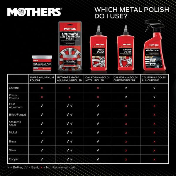 MOTHERS Ultimate Mag and Aluminum Polish meticulously cleans, restores and protects any metal surface to that next level, high-gloss shine and brilliance using ultra-fine, SiO2 infused nano-quartz abrasives. Safe for any uncoated metal, including aluminum, billet, stainless steel, nickel, brass, silver and copper. Incredible results when used by hand, or with any of the metal polishing tools from the MOTHERS PowerBall line.