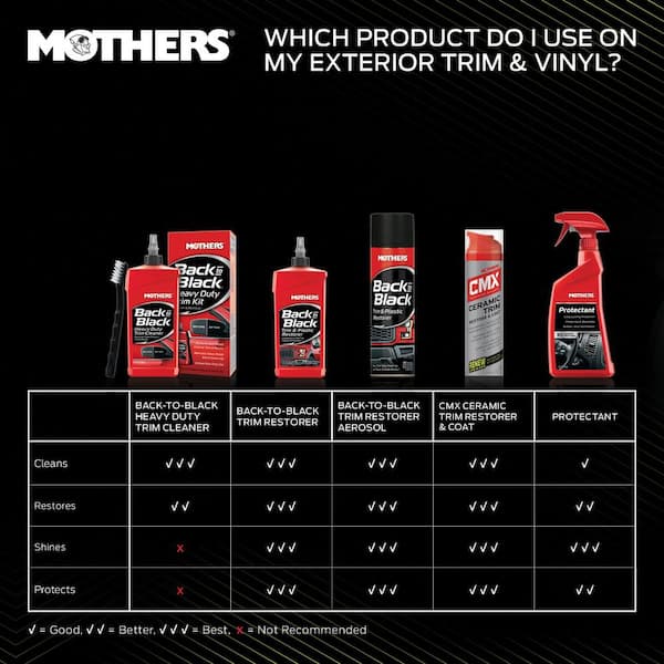 Coatings, sealants and waxes protect our paint, but unpainted exterior rubber, plastic and vinyl surfaces can often be overlooked, and time and the elements can take their toll. Whether it’s your daily commuter or your weekend driver, these surfaces need protection. Mothers CMX Ceramic Trim Restore and Coat instantly reveals that dark, factory-new color with superior ceramic richness. Utilizing a unique acrylic-Si02 nano-quartz blend, you’ll be left with an ultra-durable, super-hydrophobic, heat resistant protection barrier, preventing further deterioration caused by sun, smog, ozone, water, chemicals and airborne contaminants.