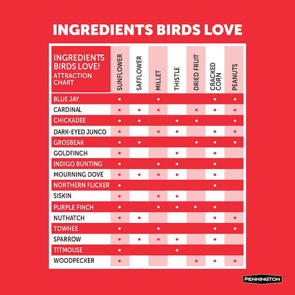 Pennington Premium Birder’s Seed Blend Bird Food is specially formulated to attract different types of birds to your backyard feeder. Made from 100% real fruit, nuts, seeds, and grains, which include black oil sunflower and safflower seed. Vitamins and mineral supplements are added to the bird seed and feed blend to create an enriched diet that birds love.
