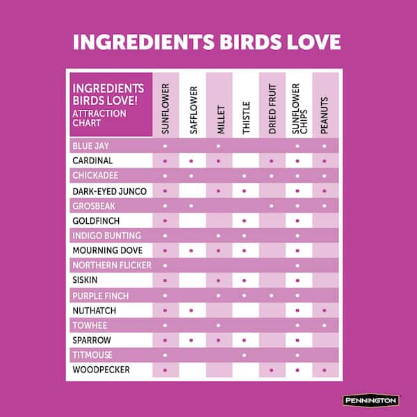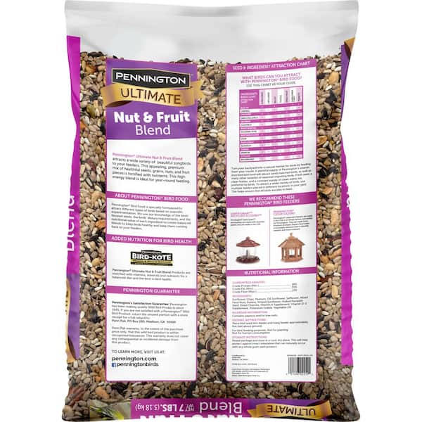 Pennington Ultimate Nut and Fruit Bird Seed Blend attracts a wide variety of beautiful songbirds to your feeders. This appealing, premium mix of healthful seeds, grains, nuts and fruit pieces is fortified with nutrients, which include sunflower chips, black oil sunflower, safflower seed and more. This high energy bird food blend is ideal for year-round bird feeding.