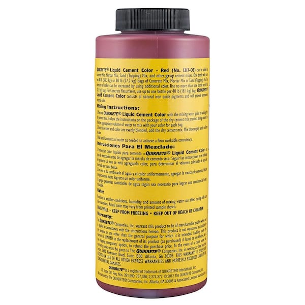 Quikrete 10 oz. Liquid Cement Color – Red is used to enhance your cement based projects. Easy to use by mixing with water, then mixing into the dry mix, this color can also be added to stucco, sand topping and mortar. Quikrete 10 oz. Liquid Cement Color – Red is integrated into the cement mix when used as directed, so the color will never fade away from your decorative projects.