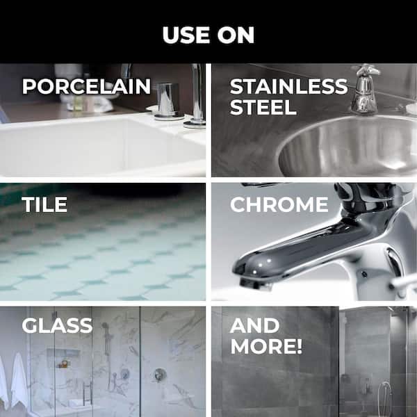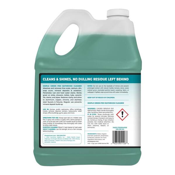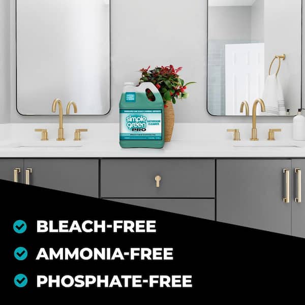 Simple Green PRO Bathroom Cleaner is specially formulated to dissolve and remove dirt, lime scale, mineral deposits, hard water stains, soap scum, light rust, and oxidation without harming protective finishes. Use on ceramic, glass, porcelain, stainless steel, aluminum, chrome, copper, and more. Works great on sinks, showers, toilets, tubs, faucets, fixtures, and drains. Deodorizes as it cleans. Bleach and ammonia free.