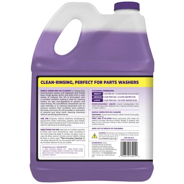 Simple Green Pro HD is a heavy-duty cleaner and degreaser that breaks down tough grease and grime. This powerful formula removes dirt and stains from a wide variety of surfaces including engines, car exteriors, tools, machinery, floors, walls, and more. Formulated with a corrosion inhibitor making it ideas for metals. It’s also non-degrading to plastics and clean rinsing. The cost-effective concentrate can be custom diluted for specific cleaning jobs and used in pressure washers, carpet cleaners, floor scrubbers, ultrasonics, dip tanks, and other cleaning equipment. Pro HD provides an effective alternative to solvents and other harsh cleaning chemicals without sacrificing performance.