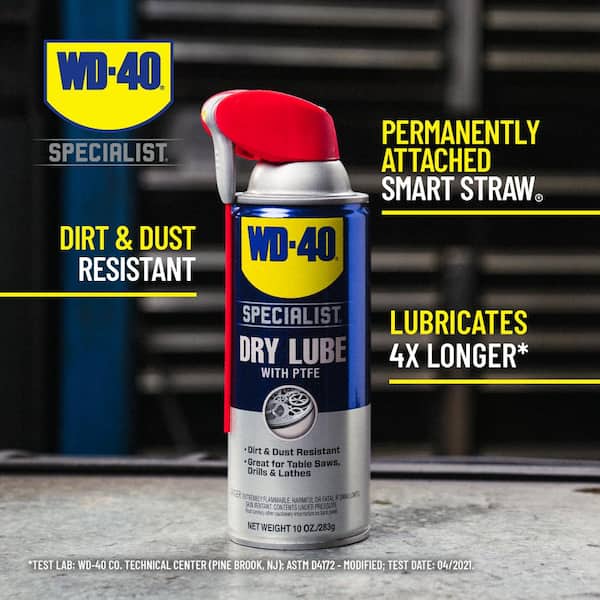 A dry lubricant that keeps your equipment running smoothly with long-lasting corrosion protection that does not attract dirt, dust, or oil. WD-40 Specialist Dry Lube with PTFE provides superior lubrication and long-lasting corrosion protection with no oily residue. Best used where cleanliness and maximum performance are required as it dries quick leaving behind a lubricating film that resists dirt, dust and oil buildups. Great for reducing friction and wear on blades and bits, door and window tracks, slides, conveyor belts, rollers, hinges, table saws, lathes, power tools and equipment. Effective in temperatures ranging from -50° F to 500° F.