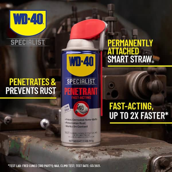 A fast-acting penetrant with capillary action to penetrate deep into crevices, threads and seams to break the rust bonds that hold stuck parts together. WD-40 Specialist Penetrant Fast-Acting low odor formula works on contact to free rusted nuts, bolts, threads, locks, and chains leaving behind a protective layer that prevents rust and corrosion from re-forming. It is 50-state VOC compliant and safe to use on metal, rubber and plastic parts. Penetrates rust to free up stuck, frozen, or seized equipment and parts Safe to use on metal, rubber and plastic parts Ideal for use on nuts, bolts, threads and locks 50-state VOC compliant.