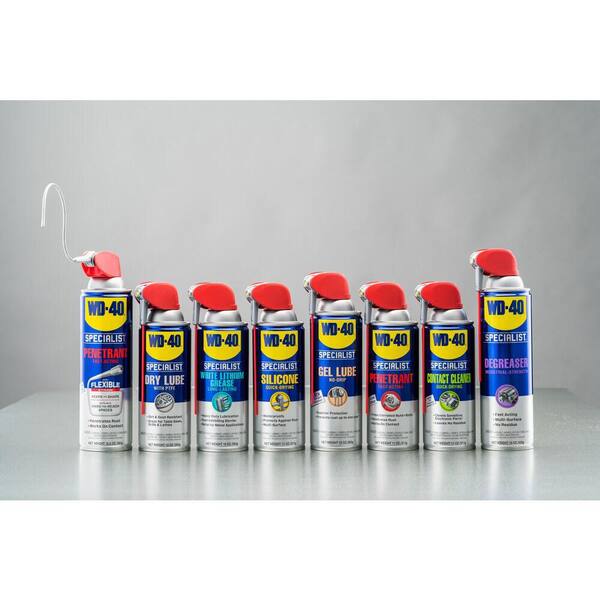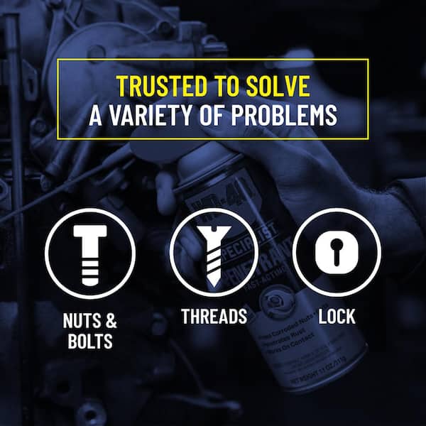 WD-40 Multi-Use Product protects metal from rust and corrosion, penetrates stuck parts, displaces moisture and lubricates almost anything. The WD-40 Multi-Use Product is truly a in. toolkit in a can in. with its permanently attached Smart Straw that Sprays 2 Ways. with more than 2,000 documented uses, it has been the go-to resource to get the job done for more than 68-years. Lubricates moving parts such as hinges, wheels, rollers, chains and gears. Protects against rust and corrosion on items like tools and sporting equipment. Penetrates to free stuck corroded parts like nuts, bolts, valves and locks. Restores and protects. Displaces moisture to restore water flooded equipment such as engines, spark plugs and power tools. About WD-40 Brand We exist to create positive lasting memories in everything we do. We solve problems. We make things work smoothly. We create opportunities. Our mission is to deliver unique, high-value solutions for a wide variety of maintenance needs in workshops, factories and homes. Our brand delivers the trust and performance needed to instill confidence and empower people to get out there and get the Job Done Right.