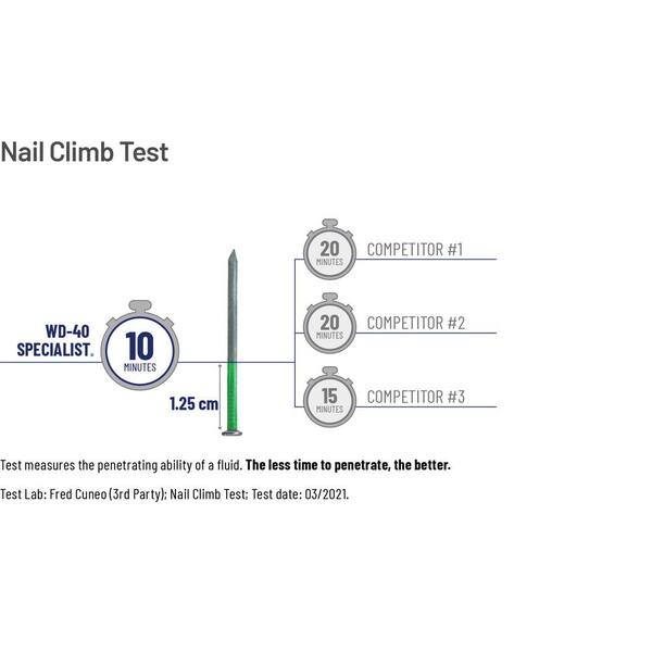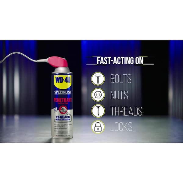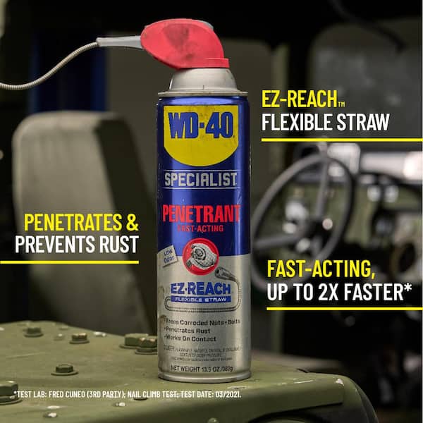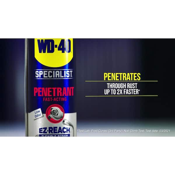 WD-40 SPECIALIST Penetrant is a fast-acting penetrant with capillary action to penetrate deep into crevices, threads and seams to break the rust bonds that hold stuck parts together. It is a low odor formula that works on contact to free rusted nuts, bolts, threads, locks and chains leaving behind a protective layer that prevents rust and corrosion from re-forming. Now the job is even easier with our proprietary 8 in. flexible straw that bends and keeps its shape, allowing unlimited access to hard-to-reach places. Penetrates up to 2x faster than the competition. Prevent rust 10x longer than the competition. WD-40 SPECIALIST Penetrant penetrates rust to free up stuck, frozen or seized equipment and parts. Safe to use on metal, rubber and plastic parts. Ideal for use on nuts, bolts, threads and locks. 50-state VOC compliant. Test Lab: Fred Cuneo (3rd Party), Nail Climb Test, Test date: 03/2021. Test Lab: WD-40 Co. Technical Center (Pine Brook, NJ), ASTM B117, Test date: 02/2021.
