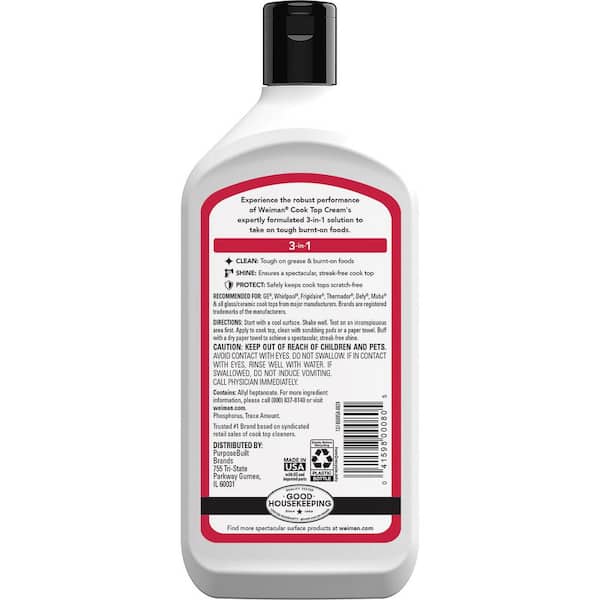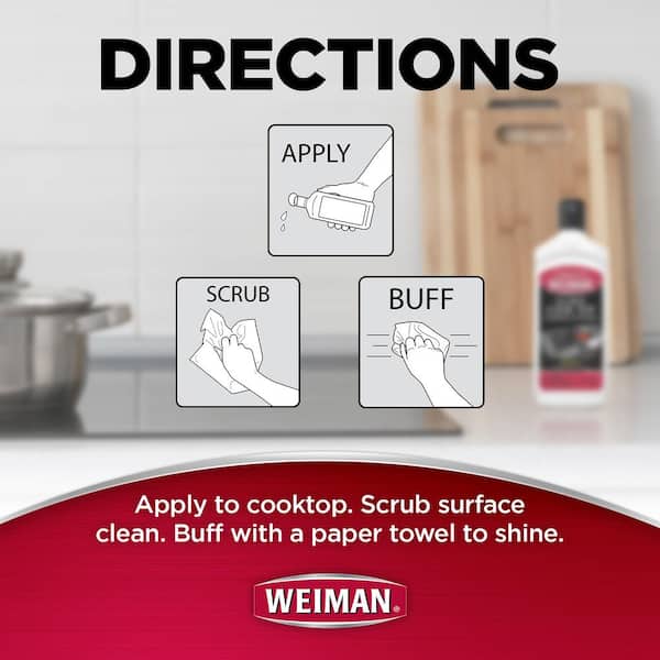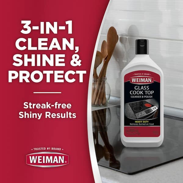 Enhance the natural beauty of cooktop surfaces in your home with the Weiman Glass and Ceramic Cooktop Cleaner and Polish. The Weiman heavy-duty Glass Cook Top Cleaner and Polish is engineered with a streak-free, non-abrasive formula to clean, shine and protect all glass/ceramic cooktop, countertop and bar surfaces without scratching or damaging your appliances. The Weiman Glass Cook Top Cleaner and Polish is a cleaning liquid designed with a gentle, yet effective formula that safely cleans up stubborn stains, splattered food and greasy, oily residue to revitalize and maintain your surfaces that keeps your kitchen shining brighter and longer. Weiman heavy-duty Glass and Ceramic Cleaner and Polish is specially formulated to remove grease, grime, dirt and fingerprints while also made to easily cut through the toughest burned-on food and baked stains, allowing you to achieve the perfect results your home deserves. A unique, non-toxic formula, safe to use regularly on any smooth top range, electric flat top grill, induction grill and all radiant, halogen glass, ceramic or glass cooktops. This product cleans and polishes with passion to reveal the superior shine of your countertop surfaces, making the Weiman heavy-duty Glass Cooktop Cleaner and Polish an essential for everyday treatment. Weiman Products is the perfect home, chef, pro, scratch resistant, cleansing, household, professional, and at work solution for all of your cooktop cleaning and buffing needs.